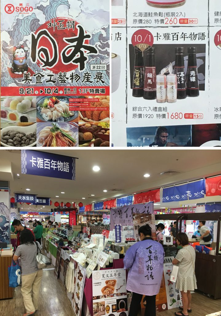 台湾中部の台中では、室次のパートナー「百年物語」さんが、百貨店の催事場に出店。室次の商品は非常に注目されており、特に、天然醸造醤油「龍馬」と粉末醤油「黄金ソルト」は、あの今治タオルに匹敵するほどの人気ぶりでした。