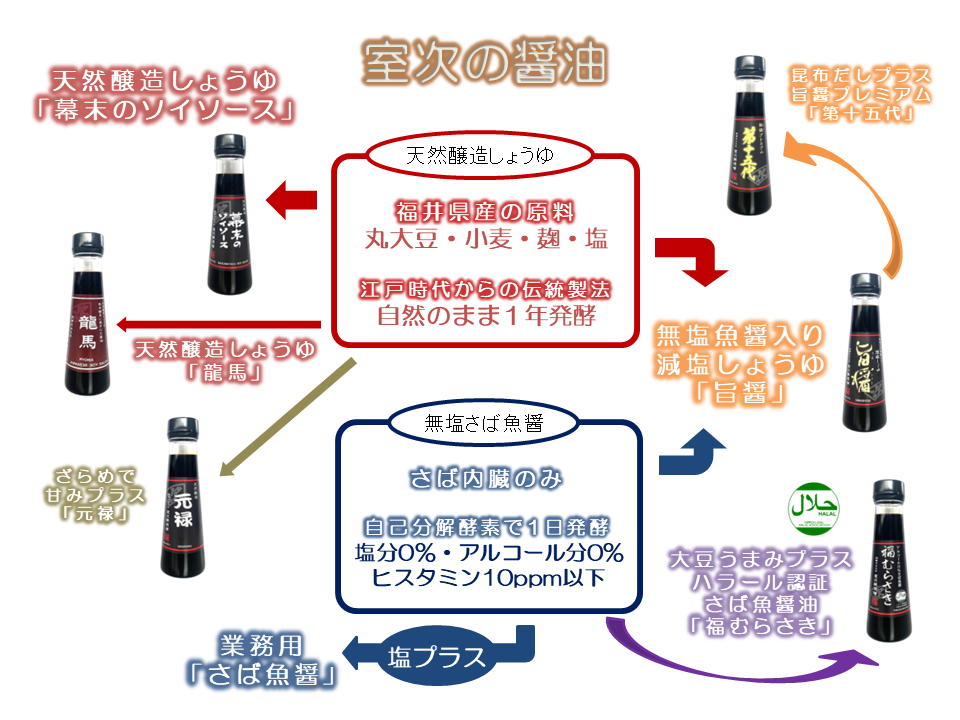 室次の醤油は「天然醸造しょうゆ」と「無塩さば魚醤」がベースです!